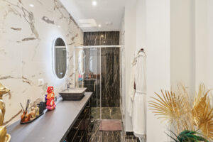 Aménagement d’une salle de bain de 6 m² dans un style Art Déco raffiné, alliant élégance et fonctionnalité. L’espace inclut un double vasque aux lignes géométriques, une baignoire balnéo pour deux personnes. Le design met l’accent sur des motifs caractéristiques, des contrastes de couleurs audacieux, et un éclairage soigneusement intégré pour créer une atmosphère luxueuse et intemporelle.